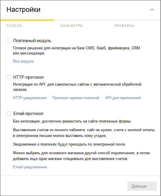 Выберите способ подключения — HTTP-протокол и нажмите Далее.