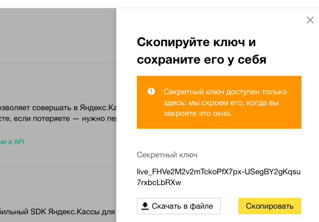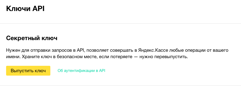 Чтобы получить секретный ключ, необходимо в левом меню выбрать пункт Настройки — Ключи API, в блоке «Секретный ключ» нажмите Выпустить ключ.