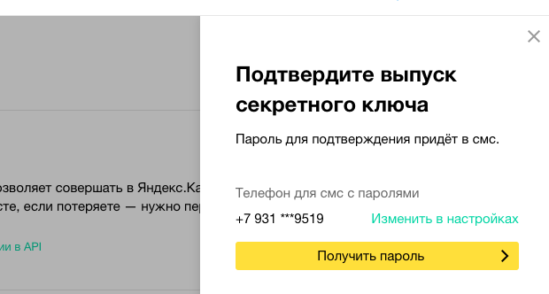 Подтвердите выпуск ключа паролем — он придёт в смс на номер, который привязан к личному кабинету, если номер еще не привязан, то Яндекс предложит привязать номер к аккаунту.